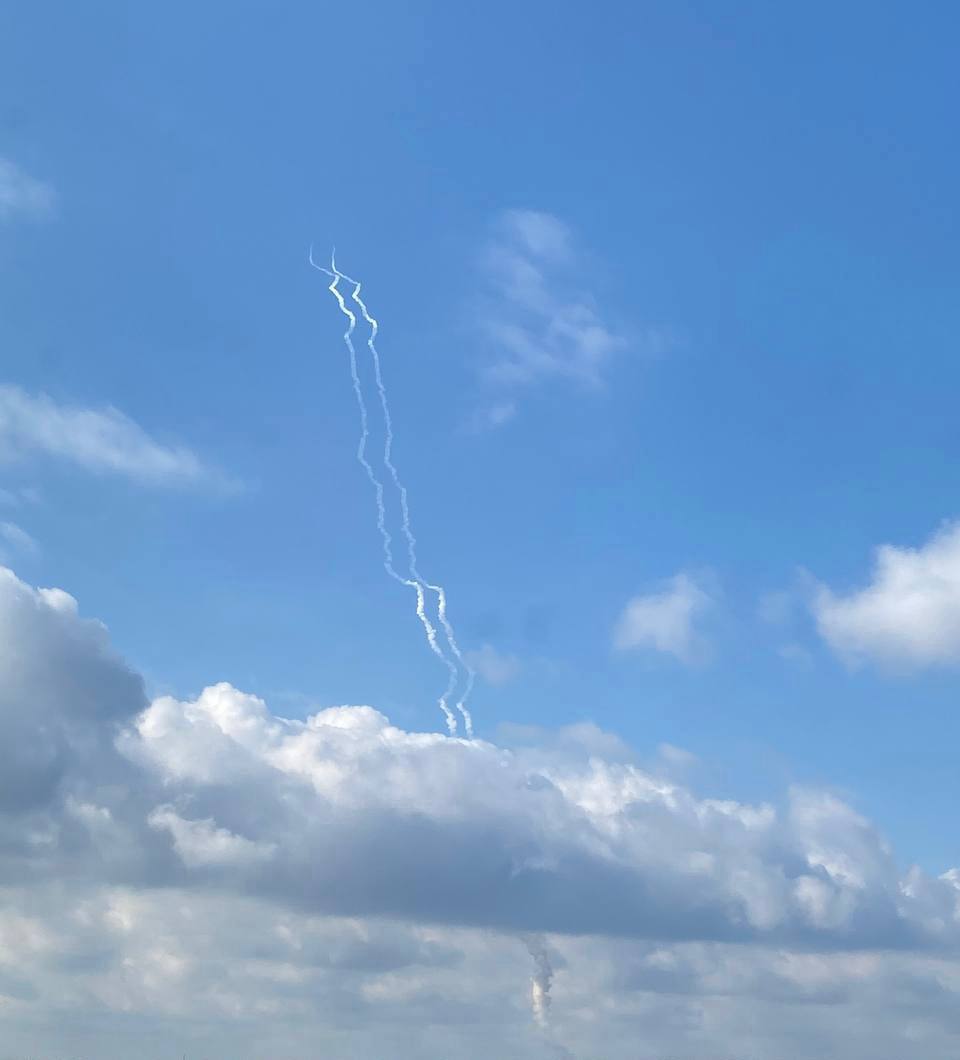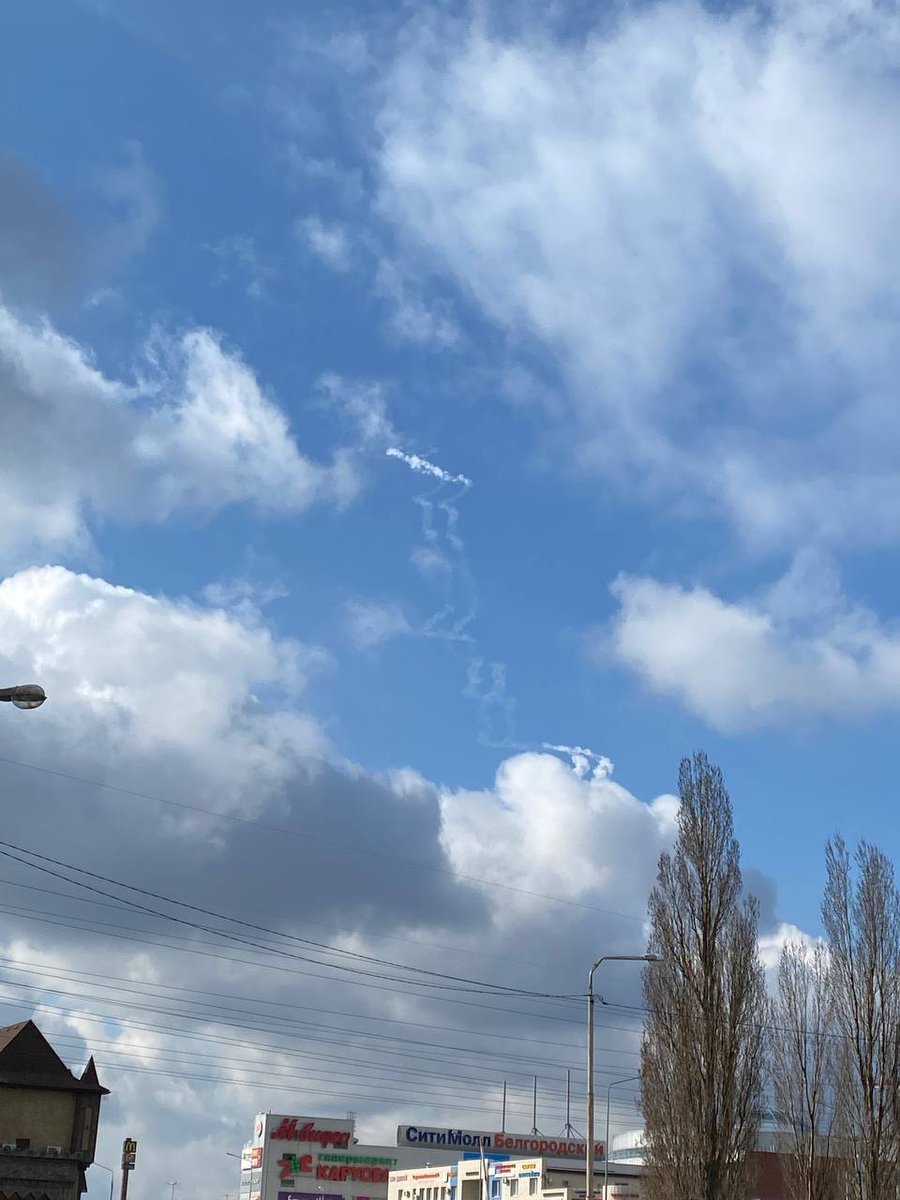 Жители города массово публикуют фотографии сбитой ракеты в небе над Белгородом.