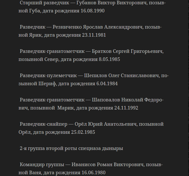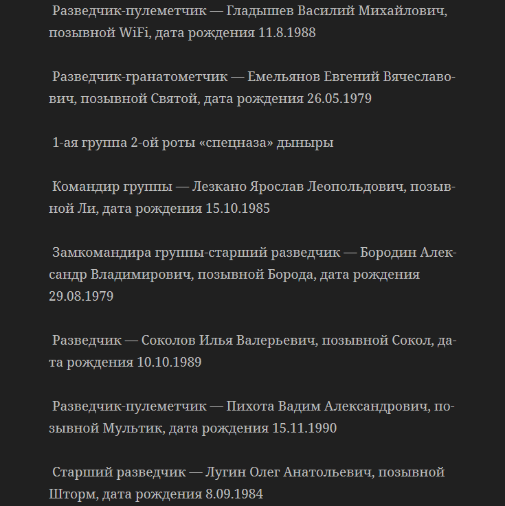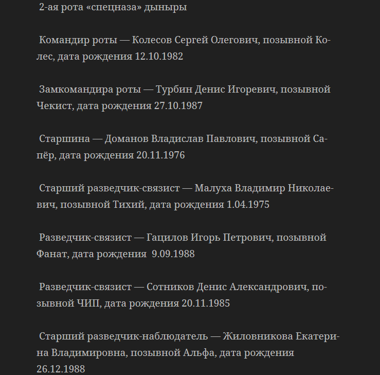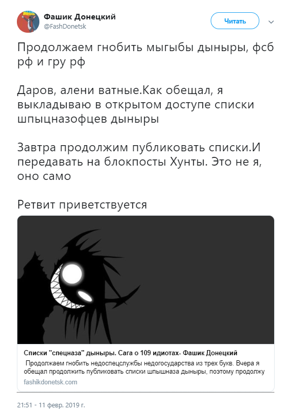 "Продолжаем гнобить мыгыбы дыныры, фсб рф и гру рф. Даров, алени ватные. Как обещал, я выкладываю в открытом доступе списки шпыцназофцев дыныры. Завтра продолжим публиковать списки. И передавать на блокпосты Хунты. Это не я, оно само", - написал блогер.