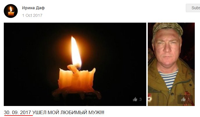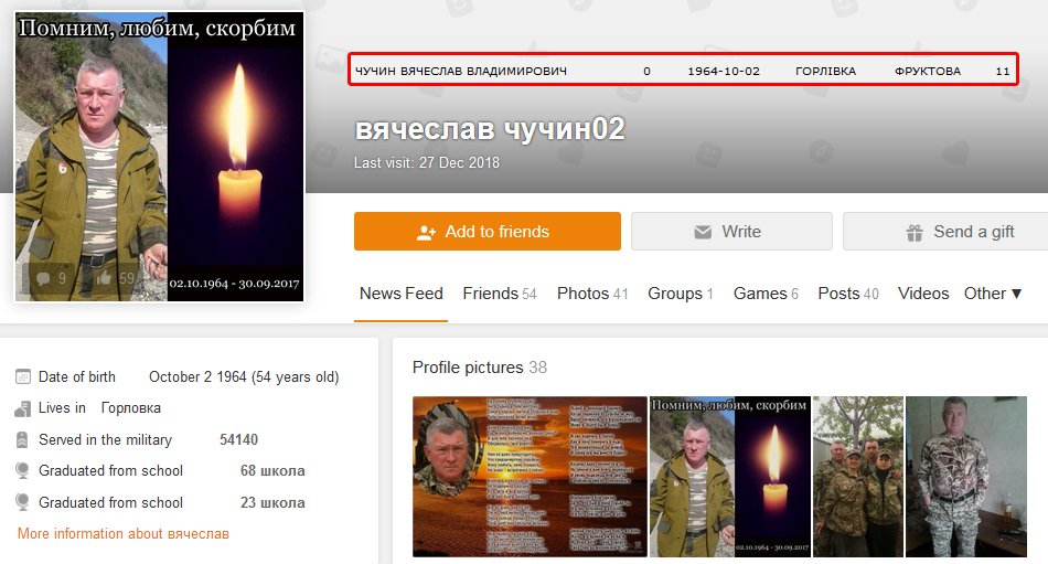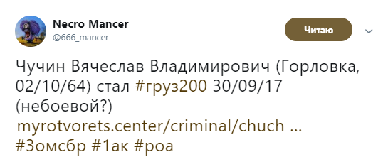 "Чучин Вячеслав Владимирович (Горловка, 02/10/64) стал груз200 30/09/17 (небоевой?)", - говорится в сообщении.