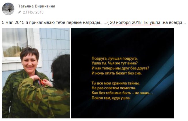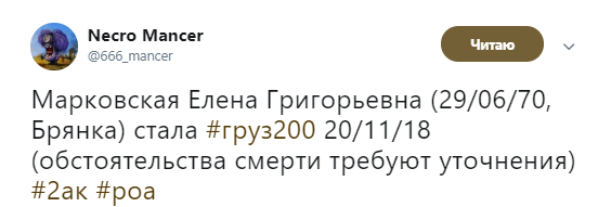 "Марковская Елена Григорьевна (29/06/70, Брянка) стала грузом 200 20/11/18 (обстоятельства смерти требуют уточнения)", - говорится в сообщении.