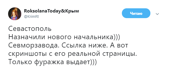 "Севастополь. Назначили нового начальника))) Севморзавода. Ссылка ниже. А вот скриншоты с его реальной страницы. Только фуражка выдает)))", - говорится в сообщении.
