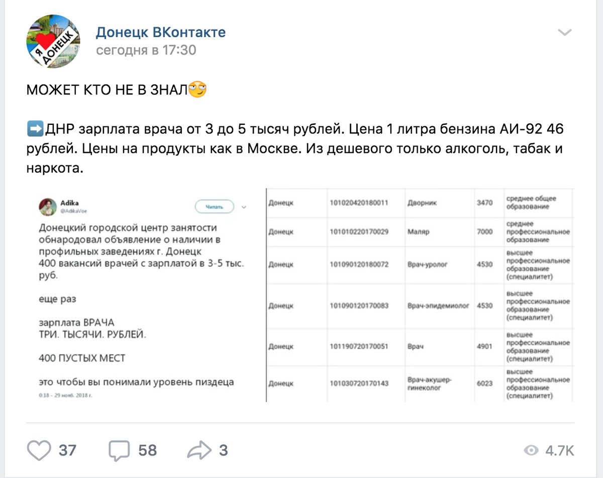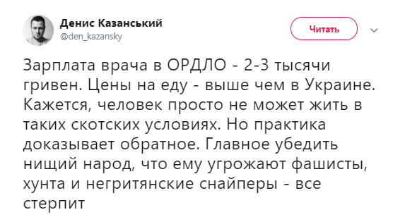 "Зарплата врача в ОРДЛО - 2-3 тысячи гривен. Цены на еду - выше чем в Украине. Кажется, человек просто не может жить в таких скотских условиях. Но практика доказывает обратное. Главное убедить нищий народ, что ему угрожают фашисты, хунта и негритянские снайперы - все стерпит", - говориться в сообщении.