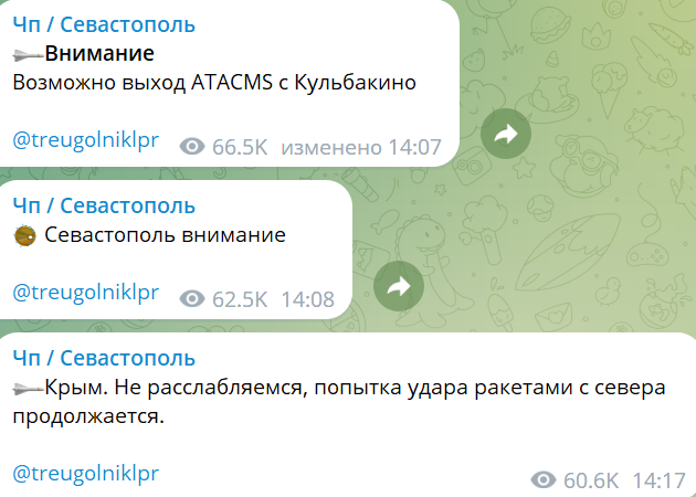Местные Telegram-каналы сообщают о возможном "выходе ATACMS с Кульбакино". Также оккупанты в Крыму боятся, что будет ракетный удар с "севера" - Украины.