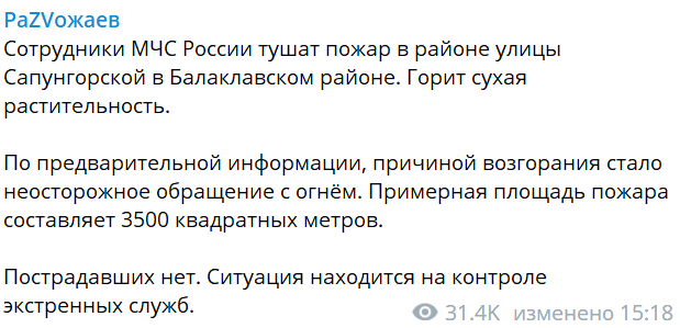 "Сотрудники МЧС России тушат пожар в районе улицы Сапунгорской в Балаклавском районе. Горит сухая растительность. По предварительной информации, причиной возгорания стало неосторожное обращение с огнем", - отметил Развожаев.