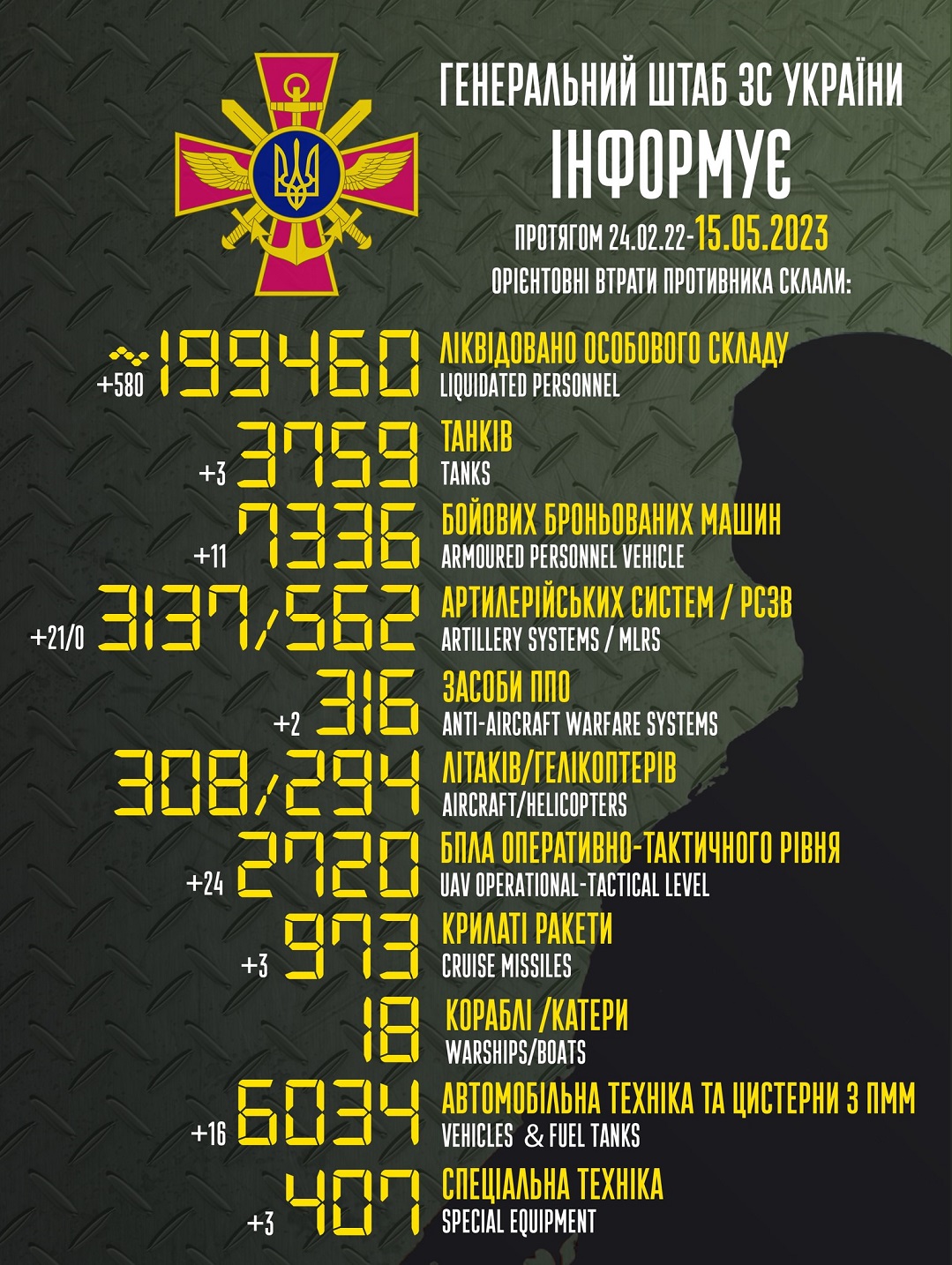 Так, общие боевые потери противника с 24.02.22 по 15.05.23 ориентировочно составили: