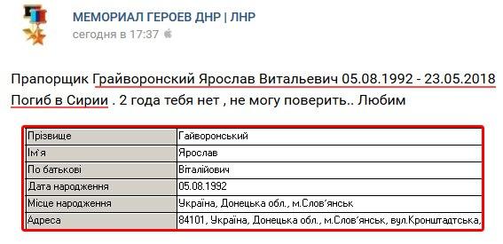 Во время боевых действий в Сирии погиб Ярослав Гайворонский, который воевал на стороне боевиков против украинских военных на Донбассе.