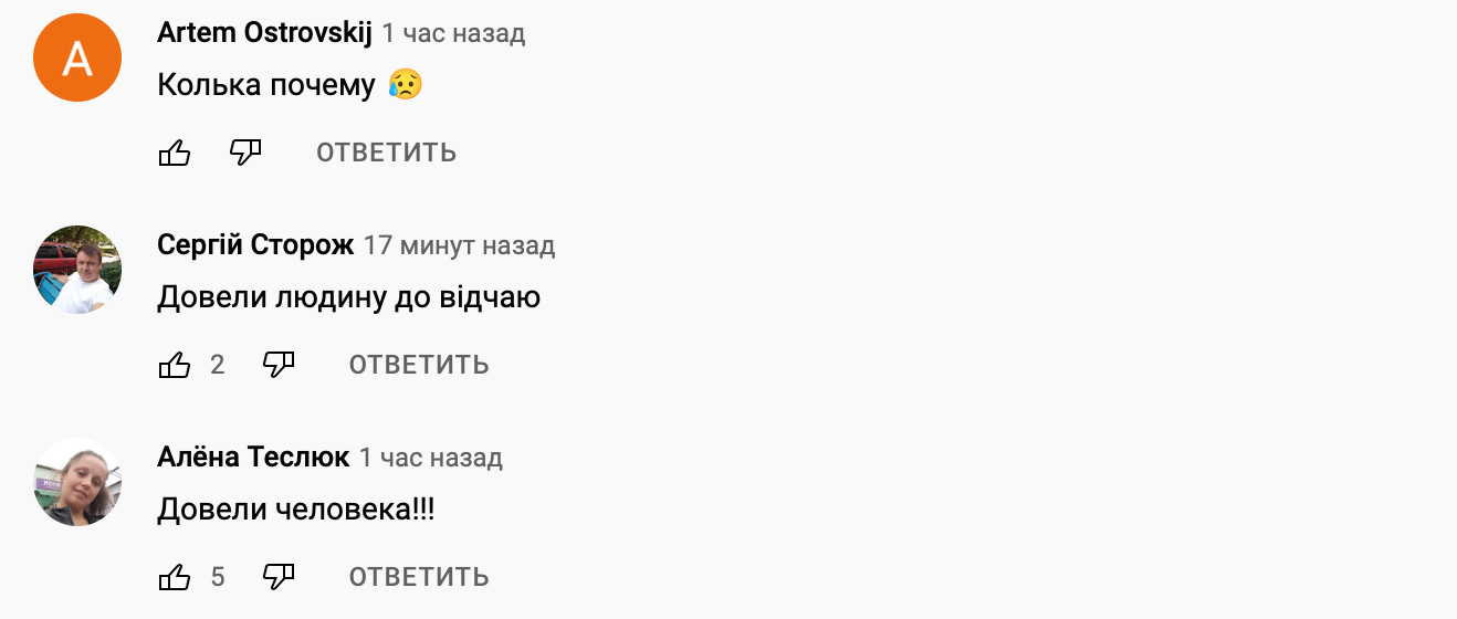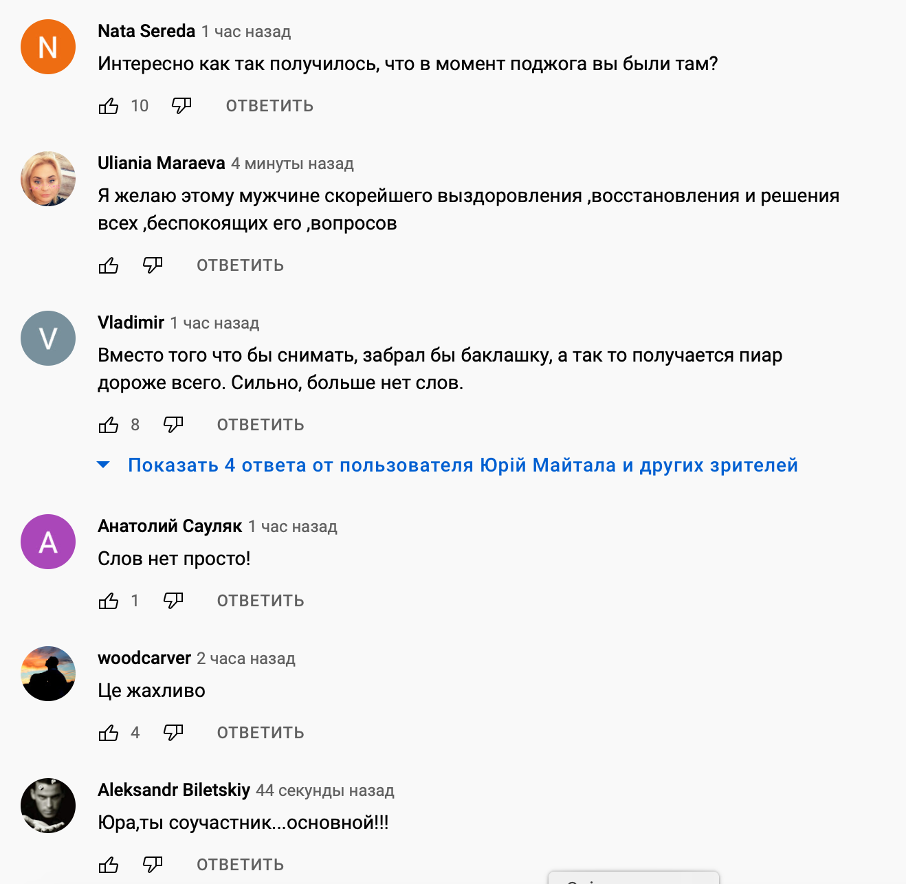 Комментаторы под видео в ютуб выражают свои соболезнования и предполагают, что его "довели" до самосожжения. Однако некоторые из них обвиняют Юрия Майтала, местного активиста, который не бросился спасать мужчину, а только снимал все на камеру.