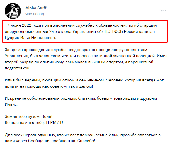 Украинские военные ликвидировали старшего оперуполномоченного 2-го отдела Управления "А" ЦСН ФСБ России капитана Илью Цуприка по прозвищу "Термит".