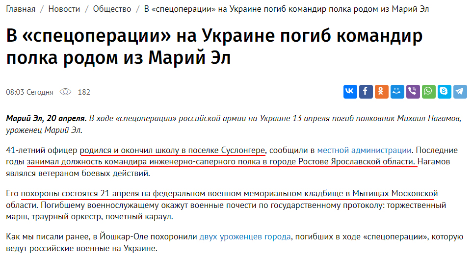 "Уроженец Суслонгера (Марий Эл) командир полковник Нагамов Михаил Александрович 1980 г.р. где-то напрочь денацифицировался 13/04/22. Жаль, конечно, что ничего не пишут про его геройский подвиг", - говорится в сообщении.