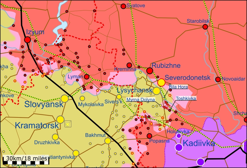 Отмечается, что войска России взяли под контроль Тошковку и продвинулись на север и северо-запад в сторону населенных пунктов Белая Гора и Мирная Долина. Они также приближаются к южным окраинам Лисичанска.