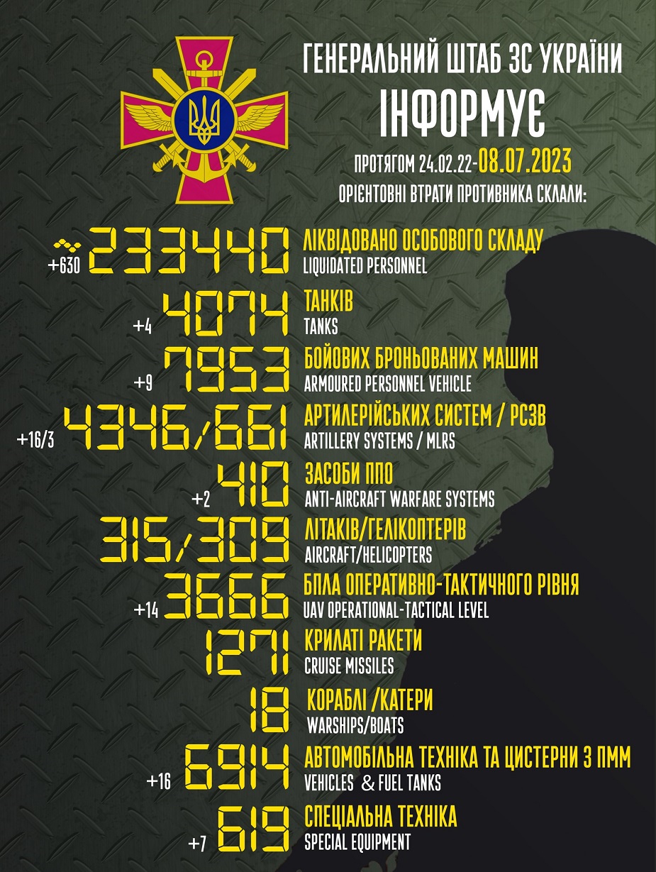 Так, общие боевые потери противника с 24.02.22 по 08.07.23 ориентировочно составили:
