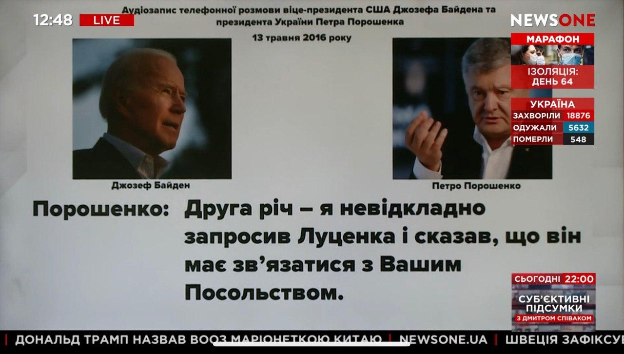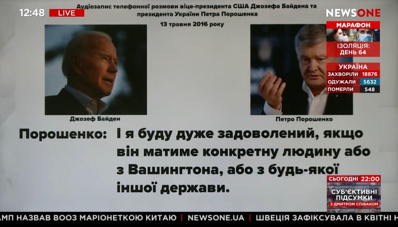 19 мая депутат Андрей Деркач провел специальную пресс-конференцию, на которой опубликовал аудиозаписи переговоров людей, голоса которых очень похожи на бывшего президента Украины Петра Порошенко, вице-президента США Джо Байдена и бывшего главы Госдепа Джона Керри.