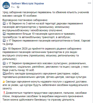 Так, правительство приостановило железнодорожное, авиа- и автобусное междугороднее и межобластное пассажирское сообщение. Также работу прекращают метрополитены Киева, Харькова и Днепра.