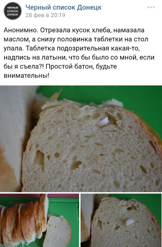 Так, в сообществе "Черный список Донецк" появился пост о том, что якобы местным жителям уже подбрасывают неизвестные вещества в виде таблеток в батон.