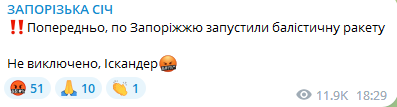 По информации начальника Запорожской областной военной администрации Юрия Малашко, в городе есть попадание по инфраструктурному объекту.