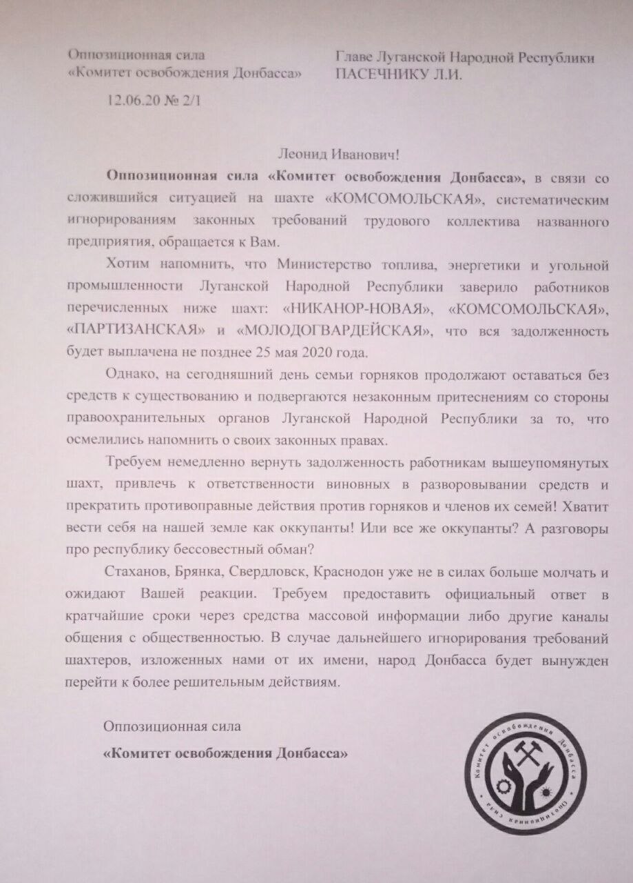 В письме говорится, что "в случае игнорирования требований горняков, народ Донбасса будет вынужден перейти к решительным действиям".