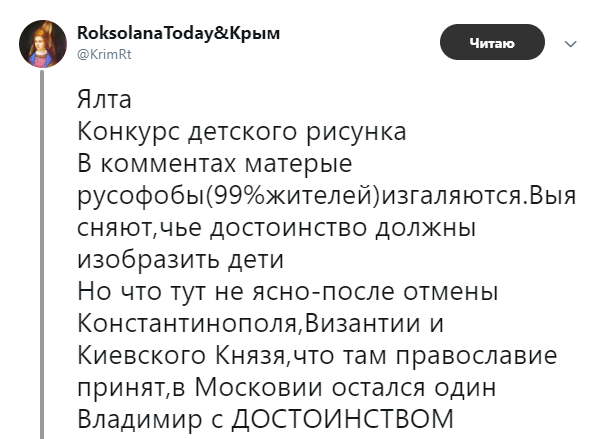 "Ялта. Конкурс детского рисунка. В комментах матерые русофобы (99%жителей) изгаляются. Выясняют, чье достоинство должны изобразить дети. Но что тут не ясно-после отмены Константинополя, Византии и Киевского Князя, что там православие принят, в Московии остался один Владимир с ДОСТОИНСТВОМ", - написала блогер.