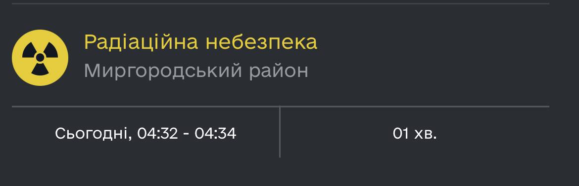 "До сведения жителей области. Сегодня во время воздушной тревоги из-за очередных атак вражеских БПЛА в системе оповещения произошел сбой и вместо воздушной тревоги по ошибке была объявлена радиационная угроза".