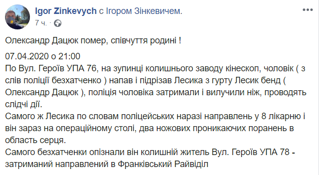 "На ул. Героев УПА, 76, на остановке бывшего завода "Кинескоп", мужчина (со слов полиции, бездомный) напал и подрезал Лесика из группы "Лесик Band" (Александр Дацюк), полиция задержала мужчину и изъяла нож, проводят следственные действия", - отметил Зинкевич.