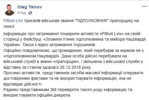 "Официально сообщаем, что гражданин, находившийся за рулем не является "подполковником Нацгвардии". Данное лицо действительно находилось на военной службе в звании "прапорщик", и было уволено с военной службы в отставку по состоянию здоровья 26 декабря 2018 года", - написал в Facebook начальник группы информации и коммуникации Западного территориального управления НГУ, подполковник Олег Тихов.