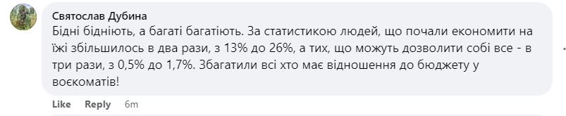 "Бедные беднеют, а богатые богатеют. По статистике людей, начавших экономить на еде, увеличилось в два раза, с 13% до 26%, а тех, что могут позволить себе все - в три раза, с 0,5% до 1, 7%. Обогатились все, кто имеет отношение к бюджету у военкоматов!" – написал один из подписчиков.
