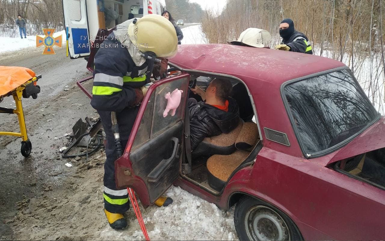 В Харьковской области 29 января произошла лобовая авария с участием двух ВАЗов. Одного из водителей зажало в авто.