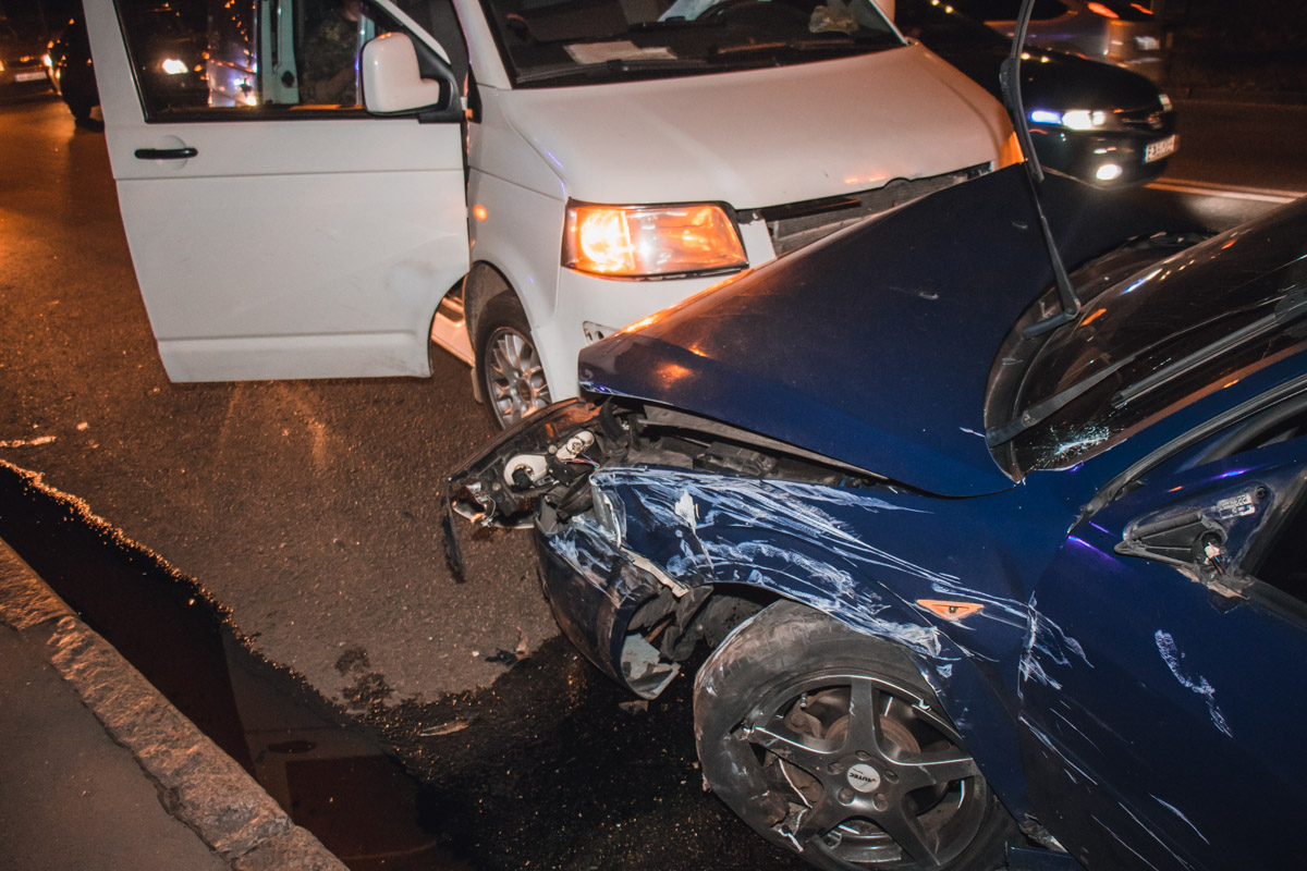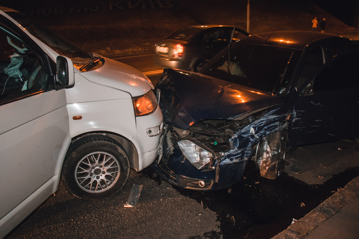 Ночью 15 июня на Броварском проспекте автомобиль Ford столкнулся с "Москвичем", после чего выехал на полосу встречного движения, где столкнулся с Volkswagen на военных номерах.