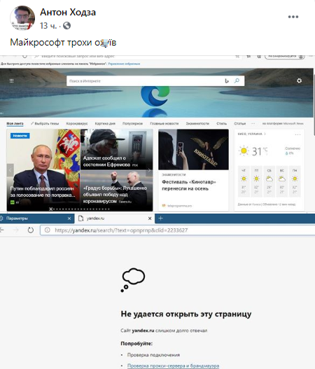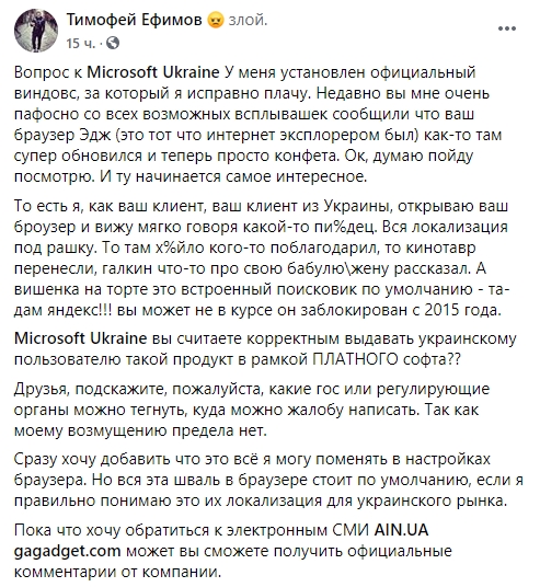 "То есть я, как ваш клиент, ваш клиент из Украины, открываю ваш браузер и вижу мягко говоря какой-то пи%дец. Вся локализация под рашку. То там х%йло кого-то поблагодарил, то кинотавр перенесли, Галкин что-то про свою бабулю\жену рассказал. А вишенка на торте это встроенный поисковик по умолчанию - та-дам яндекс!!! вы может не в курсе он заблокирован с 2015 года. Microsoft Ukraine вы считаете корректным выдавать украинскому пользователю такой продукт в рамках платного софта??", - возмутился он.