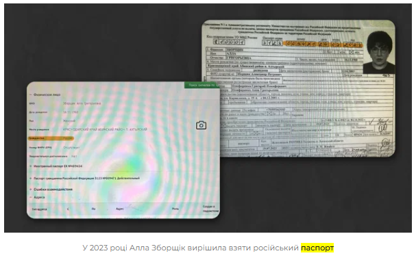 "Бизнес в России может вести любой, для этого не обязательно брать российский паспорт. Поэтому или любовь Аллы Зборщик ко всему российскому оказалась настолько сильной, или выгода от сотрудничества с агрессором была настолько большой, что в том же 2023 году Алла Зборщик решила взять российский паспорт. Отныне она - полноправная гражданка государства-агрессора, которая платит налоги и строит бизнес".
