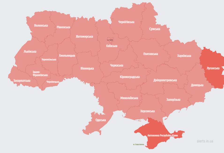На карте воздушных тревог видно, что об опасности предупреждают во всех регионах Украины.