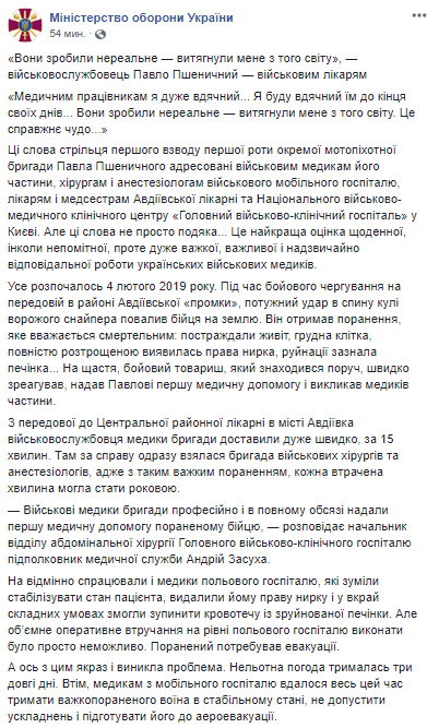 С передовой в Центральную районную больницу в городе Авдеевка военнослужащего медики бригады доставили очень быстро, за 15 минут. Там за дело сразу взялась бригада военных хирургов и анестезиологов, ведь с таким тяжелым ранением, каждая потерянная минута могла стать роковой.
