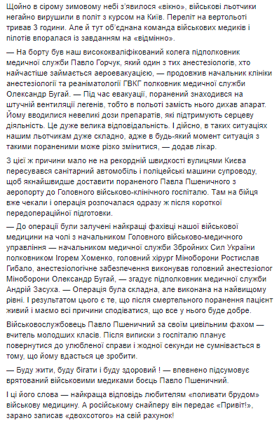 "На борту был наш высококвалифицированный коллега подполковник медицинской службы Павел Горчука, который один из анестезиологов, кто чаще занимается аероевакуациею. Во время эвакуации, ранен находился на искусственной вентиляции легких, то есть в полете вместо него дышал аппарат. Ему вводились небольшие дозы препаратов, поддерживают сердечную деятельность. Это очень большая ответственность. И действительно, в таких ситуациях нашим летчикам очень сложно, ведь в любой момент ситуация с такими ранеными может резко измениться", - отметил начальник к ГВКГ анестезиологии и реаниматологии ГВКГ полковник медицинской службы Александр Бугай.