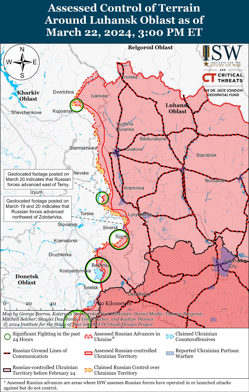 Российские войска несколько продвинулись в ходе интенсивных локализованных наступательных операций к северо-востоку от Бахмута близ Северского. Позиционные бои также продолжались возле Клещеевки и Андреевки и в районе Нью-Йорка.