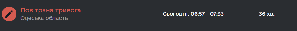 Сегодня с 06:57 до 07:33 в Одесской области продолжалась воздушная тревога. Воздушные Силы ВС Украины в 06:58 предупреждали об активности вражеской тактической авиации на востоке и юге: "Угроза применения авиационных средств поражения для прифронтовых областей".