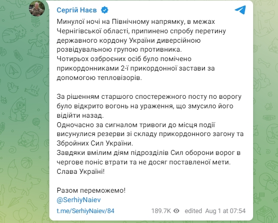 "Прошлой ночью на Северном направлении, в пределах Черниговской области, пресечена попытка пересечения государственной границы Украины диверсионной разведывательной группой противника", - написал Наев.
