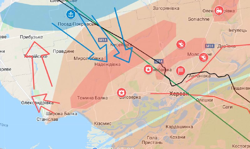 На другой карте показано, что подразделения ВС РФ в ответ на контрнаступление пытаются продвинуться в направлении Таврийского и Прибугского.