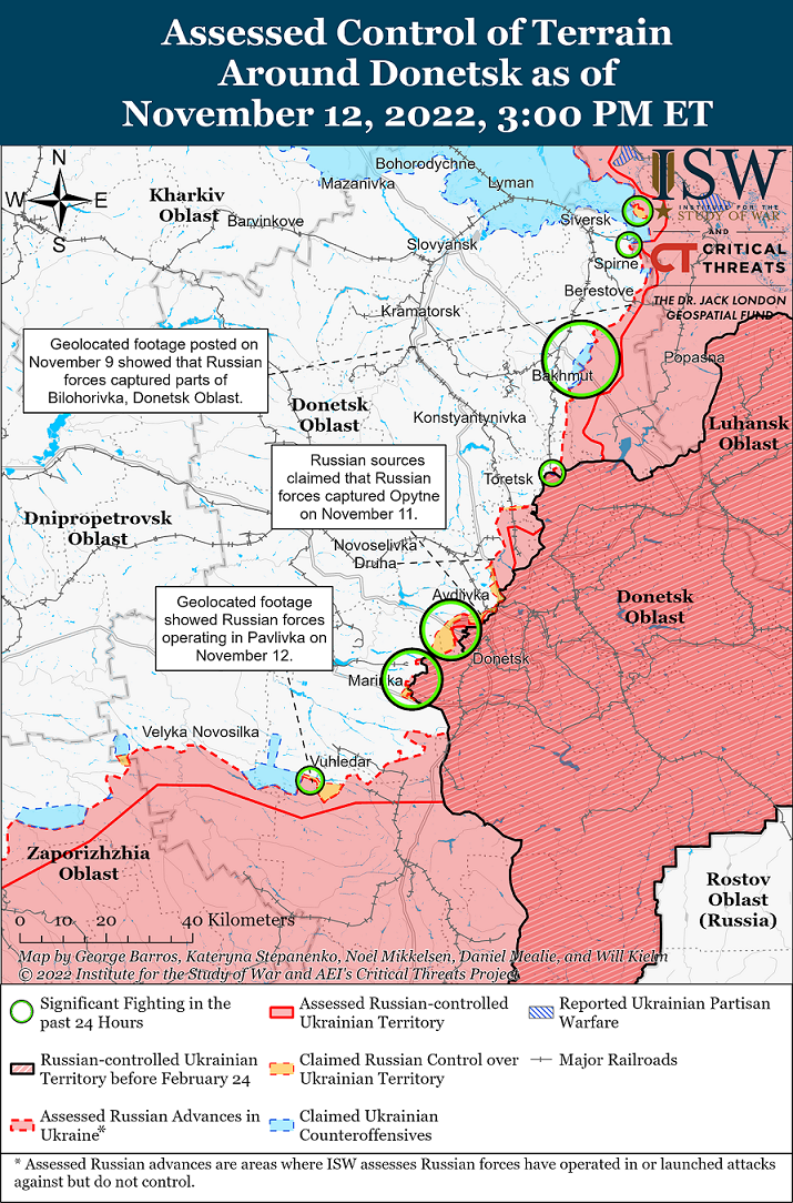 Согласно информации аналитиков, по состоянию на 12 ноября российские войска добились незначительных успехов в своем наступательном наступлении на Угледар и немного продвигались к Павловке.