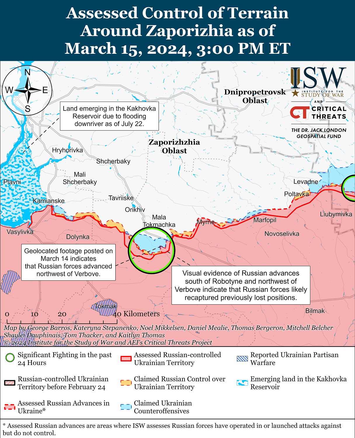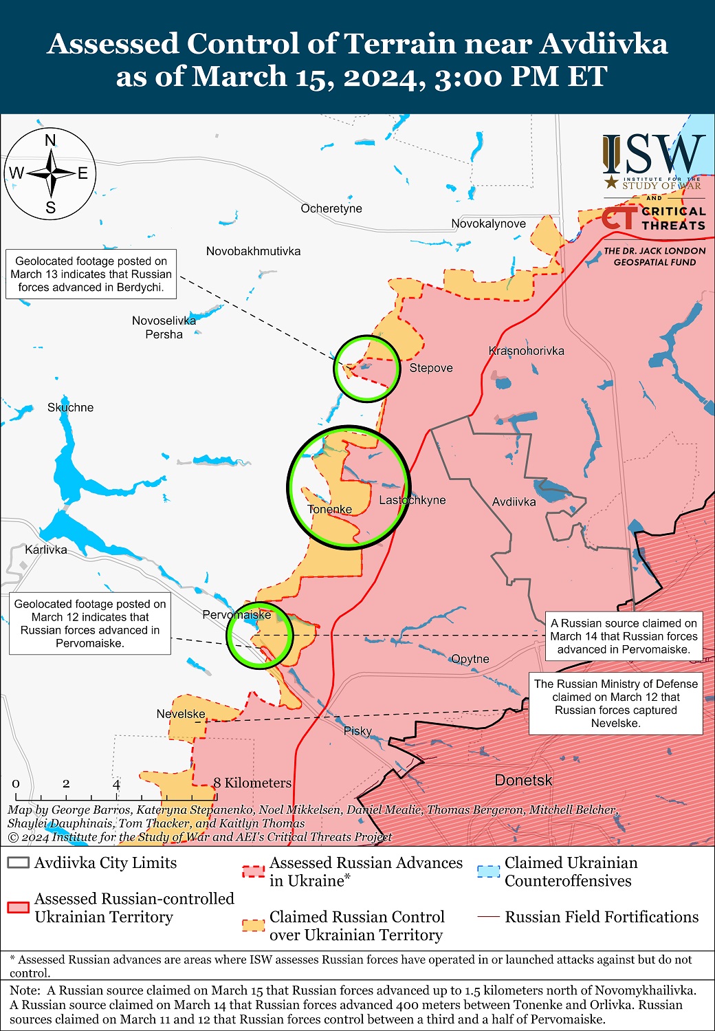 Украинские силы контролируют высоты к северо-западу от Авдеевки возле Новобахмутовки и Очеретино, что затрудняет продвижение России в этом районе. Позиционные бои продолжались в районах Новобахмутовки, Бердичей, Семеновки, Орловки, Тоненького, Первомайского и Невельского.