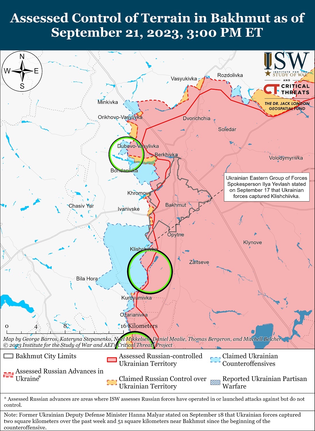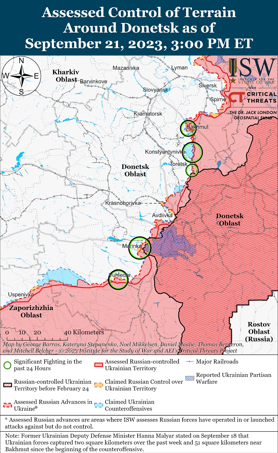 Украинские войска провели наступательную операцию вблизи Бахмута и добились успеха вблизи Отрадовки, Андреевки и Курдюмовки. Генштаб ВСУ сообщил, что украинские войска продолжали штурмовые действия к югу от Бахмута. Позиции вблизи Андреевки и Клещиевки позволяют украинским силам подвести артиллерию поближе к трассе T0513 (Бахмут-Горловка).