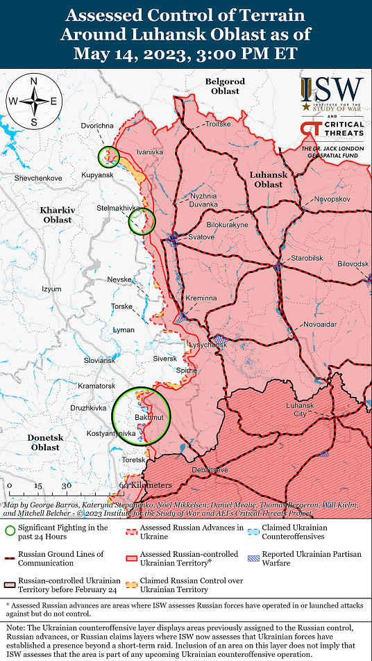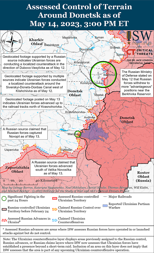 В ISW отмечают, что по состоянию на 14 мая войска российские оккупационные войска не добились дополнительных подтвержденных успехов в Бахмуте и его окрестностях. Согласно информации Генштаба Украины, оккупационные войска совершили неудачное наступление в городе-крепости, а также в 9 километрах к северо-западу от него, возле населенных пунктов Григоровки, Богдановки и Хромового. Кроме того, враг вел боевые действия в 14 километрах к юго-западу от Бахмута, вблизи Белой Горы и Предтечино.