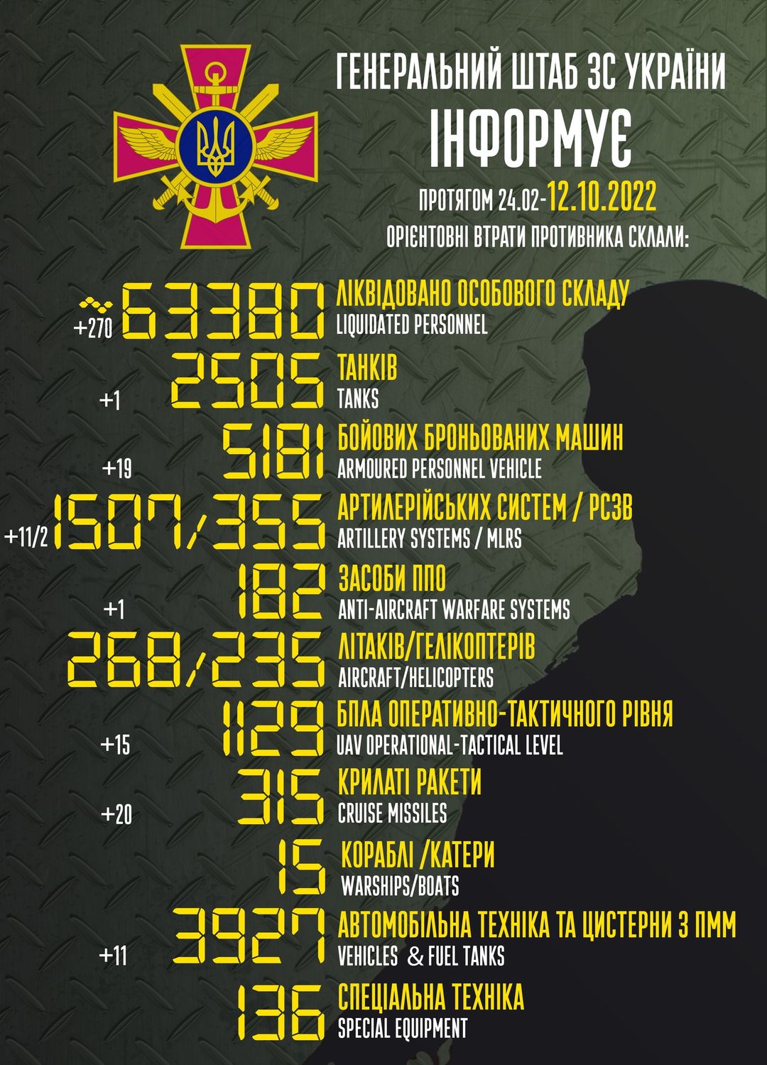 О потерях врага по состоянию на 12 октября сообщили в Генштабе ВСУ.