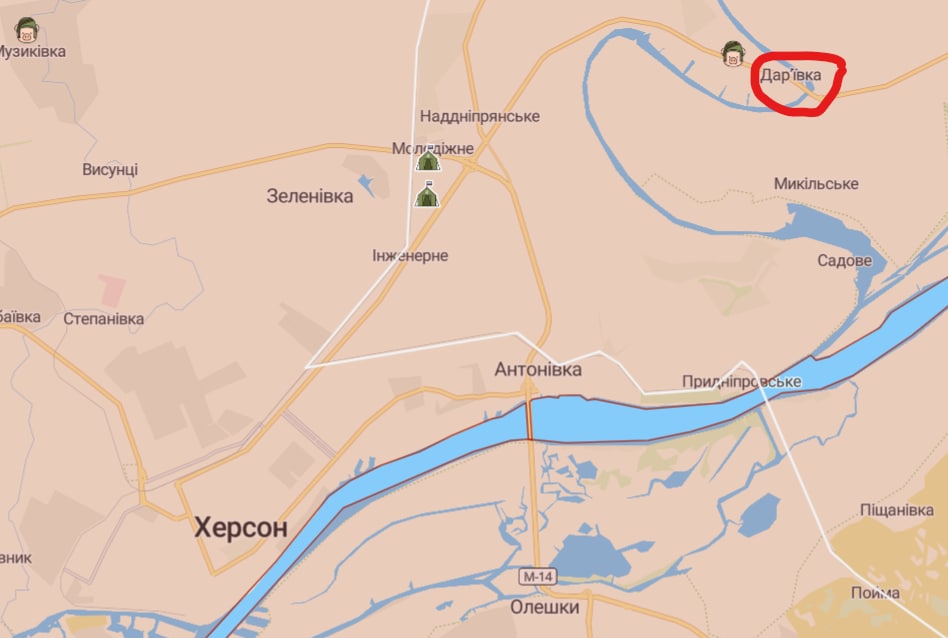 Сравнение спутниковых снимков Planet.com, сделанных 30 июля и 5 сентября, показывает, что в результате украинских ударов по российской военной инфраструктуре в Дарьевке был разрушен понтонный мост, здание у речного причала, который использовался для отправки заготовленного зерна, а также часть зданий оборудованном рядом на военном полигоне. На снимках также видно повреждение моста через реку Ингулец в результате украинских ударов, нанесенных еще 5 августа, из-за которых российским военным и пришлось строить здесь понтонный мост.