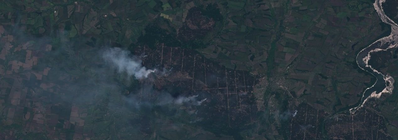 В то же время в лесах под Изюмом фиксируются масштабные пожары. На спутниковых снимках видно сразу несколько крупных очагов возгорания.