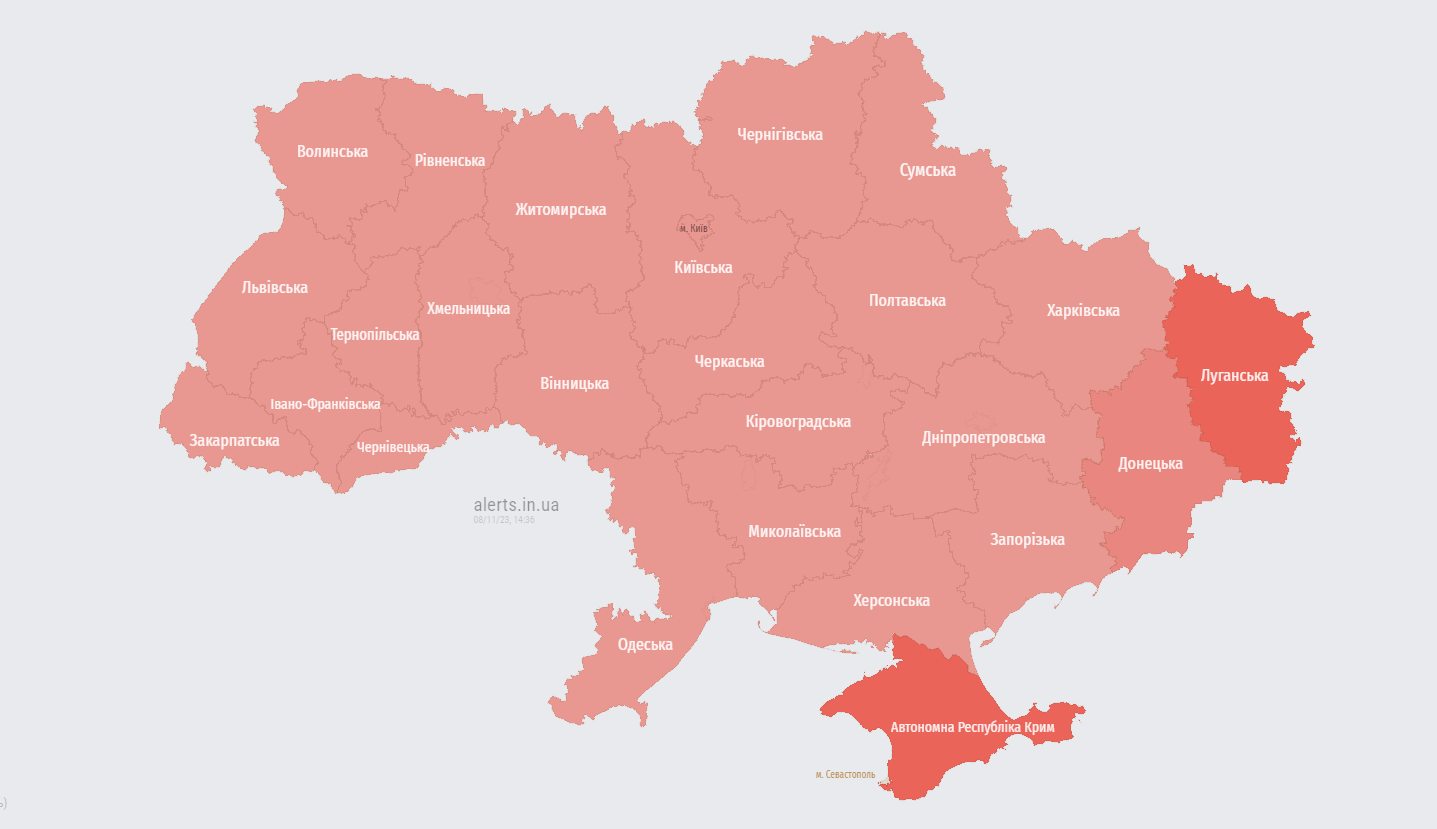 Обновлено: в 15:06 в Воздушных силах дали отбой воздушной тревоги для всех областей.
