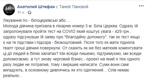 "Молодая девушка приехала в больницу номер 3 м. Белая Церковь. Сразу ей предложили пройти тест на COVID который стоит внимание - 429 грн., Сразу подсунув ей заявление о "благотворительную помощь", так как тест если есть на то основания и подозрение - бесплатный. После того как мать подняла шум деньги девушке вернули. Вот скажите как же без мата комментировать эти действия людей в белых халатах? Мы везде пишем, поддерживаем, мы везде помогаем, а тут опять очередной бизнес-проект на который я тоже однажды чуть не попал, поэтому и решил написать. Суммы они сами придумывают, в основном смотря как кто одет", - пишет Штефан.