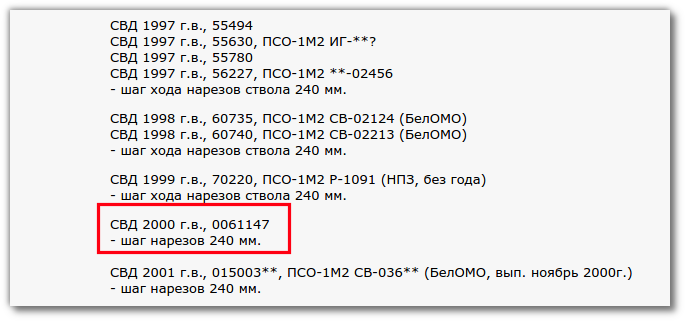 Волонтеры приводят в пример винтовку СВД с серийным номером 0061147, которая была изготовлена в 2000 году. Они подчеркивают, что СВД Щербы с номером 0061272 была изготовлена позже 2000 года, о чем свидетельствуют четыре последние цифры.