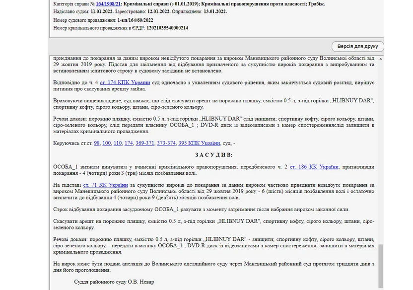 Приговор вынес Маневичский районный суд Волынской области, он опубликован в ЕРДР.