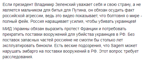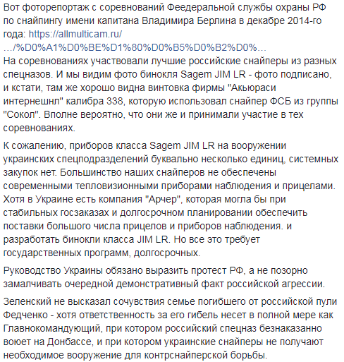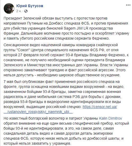 "Президент Зеленский обязан выступить с протестом против направления Путиным на Донбасс спецназа ФСБ, и против применения для убийства украинцев биноклей Sagem JIM LR производства Франции. Дальнейшее молчание просто постыдно и оскорбляет Украину и память убитого российским спецназом сержанта Федченко", - написал журналист.