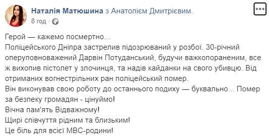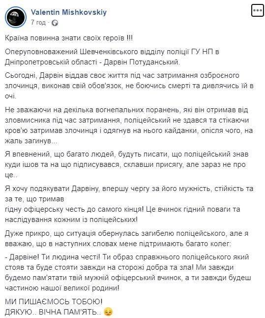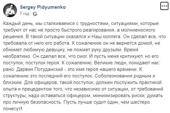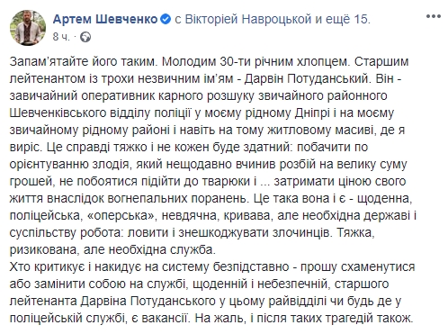 "Запомните его таким. Молодым 30-летним парнем. Старшим лейтенантом с несколько необычным именем - Дарвин Потуданский. Он - обычный оперативник уголовного розыска обычного районного Шевченковского отдела полиции в моем родном Днепре и на моем обычном родном районе и даже на том жилом массиве, где я вырос. Это действительно тяжело и не каждый будет способен: увидеть по ориентированию вора, который недавно совершил разбой на крупную сумму денег, не побояться подойти к твари и ... задержать ценой своей жизни вследствие огнестрельных ранений", - пишет он.
