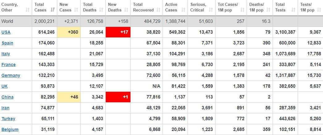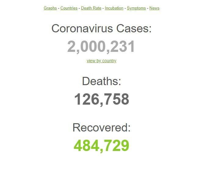 По данным западной прессы, по состоянию на 09:30 утра (по киевскому времени) в мире зафиксировали 2 000 231 случаев заражения, 126 758 человек умерли. Выздороветь смогли 484 729 зараженных.